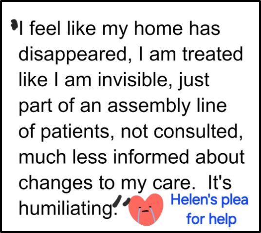 Helen just wanted to die. She felt like her home had disappeared, that she was just invisible – part of an assembly line, she felt humiliated. She asked for a meeting with the social worker and some of her friends to talk about her experience so others would know what was going on. Instead the social worker came to her room with another woman whom she didn’t identify or introduce, who stood over her with a clipboard taking notes. Helen talked about her concerns and finally said “I feel like I’m being interrogated, I feel intimidated, and I want to stop.” The social worker pleasantly assured her they could stop and asked “Do we still need to have that meeting?” Helen said “no.” The meeting she wanted had not happened. She had wanted to have the meeting, with witnesses, so things would change so that no one else would go through what she was going through. She was exhausted and I wanted her to rest, so I didn’t bring it up. I would later realize, this “listening and then do nothing” was the “standard operating procedure” that administrators at the Gardens used to get rid of concerns – “Listen, make ‘em feel good, and they”ll go away” (and probably forget all about their concerns – after all these are old people.)