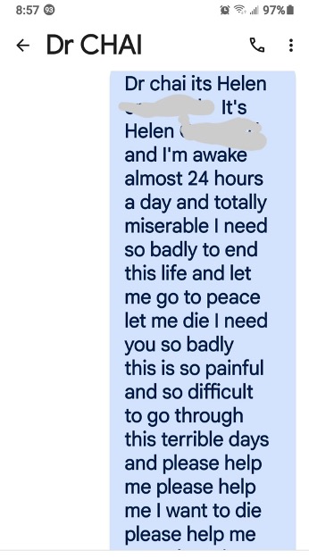 A week later, I sat with Helen. Her mood was improving as she began to respond to the antidepressant medication Dr. Chai had prescribed. She still wanted to die – I’m 100 years old and have lived a good life. Why do I wake up? I talked to her about her care options: