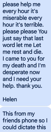 Unfortunately it would be another few weeks before I would learn about Helen’s legal rights. I did not learn about the AMA Code of Ethics until I wrote this blog. Meantime, Helen was suffering. She nicknamed one of her nurses “cold fish.” This woman was probably one of the most offensive of the staff. She’d demand, when Helen requested assistance using the restroom in the evening, that Helen decide if she then wanted to go to bed for the night. Helen was tired and it took her a minute to answer the question. When it took more than a few seconds, Nurse Cold Fish would walk out of the room, let me know what you decide – incredulously leaving her to pee in her diapers! Another time Helen complained of burning when she urinated. I asked for the nurse. Nurse Cold Fish came into Helen’s room, and when she heard Helen’s concern, she began arguing with her. You were offered a urine test on Friday and refused it! She raised her voice and repeated her words, this time leaning forward, towering over Helen, and pounding her finger on Helen’s overbed hospital table. I took a deep breath and interrupted. Is there any reason she cannot have a urine test now? I’ll contact the doctor, Nurse Cold Fish shouted over her shoulder as she exited Helen’s room. Three days later I checked with Helen and no urine sample had been collected, but she said the burning sensation was gone. I just took a deep breath and shook my head. Helen felt better and that’s what mattered. But she was also slipping into a major depression. She cried and just wanted to die. I asked her to text her doctor: